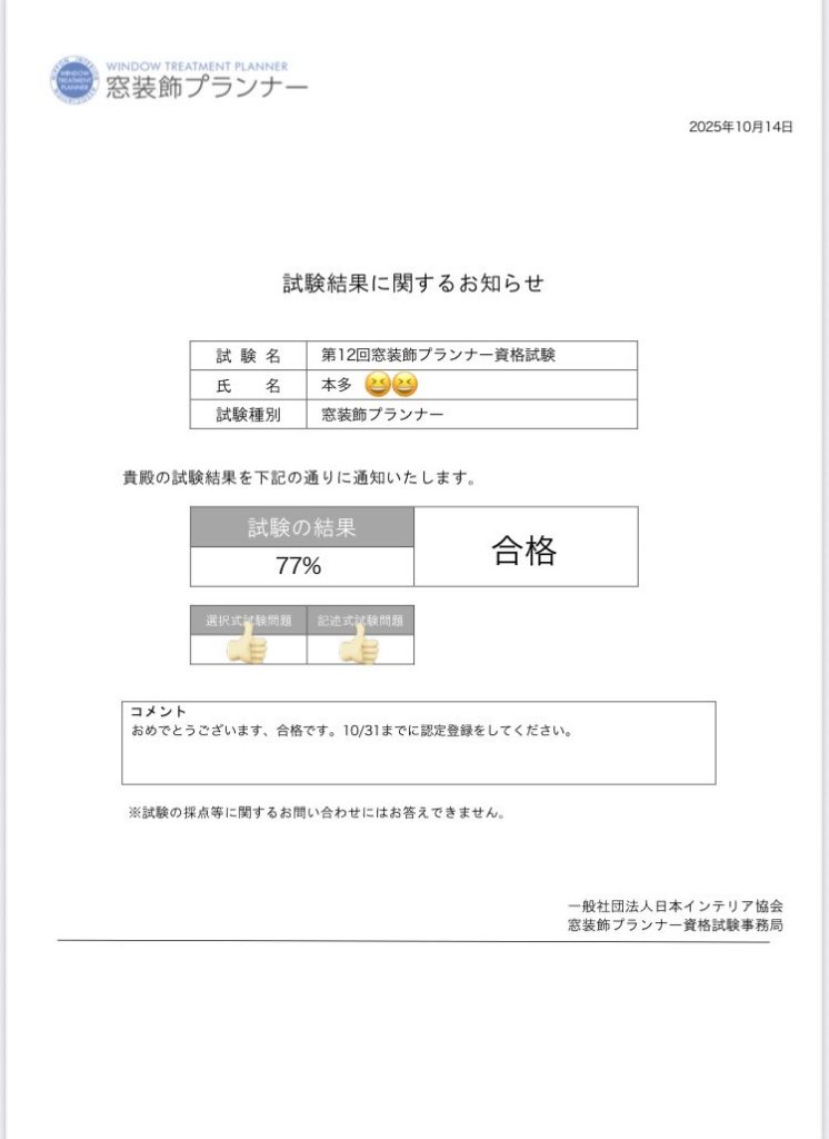 2025-10-17 / 最終更新日時 : 2025-10-17 本多 健太郎 お知らせ 当店スタッフが「窓装飾プランナー」資格に合格しました! 当店スタッフが「窓装飾プランナー」資格に合格しました。 これで当店には2人のプランナーが在籍することになり、より多くのお客様に最適な窓まわりのご提案ができるようになりました。 ぜひ、お気軽にご相談ください♪ コメントを残す コメントをキャンセルコメントを投稿するにはログインしてください。