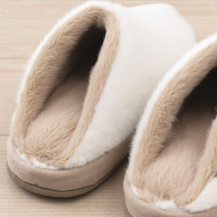 甲・甲裏・中板にあしらわらたファーが足をあたたかく包み込んでくれる、ナポレオンタイプのスリッパ。