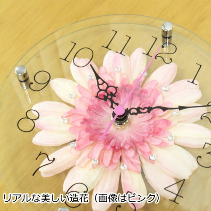 2枚の透明ガラスにリアルな造花を挟んだ美しい透明感のある時計。