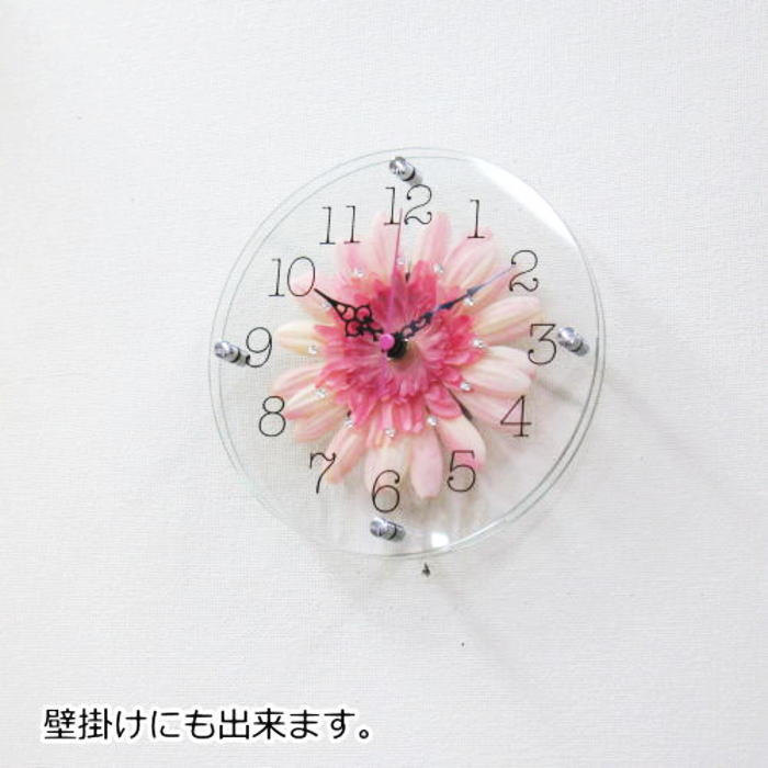 ガラスに造花を挟んだ”かわいい”おしゃれな置き掛け兼用時計。